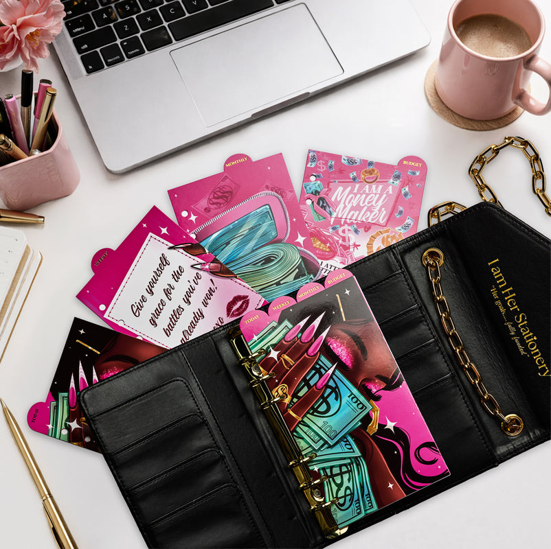Our book and binder set includes: Pretty Girls Stack Like This Savings Challenge Book, Pretty Girls Binder, 8 clear Sliding envelopes, 2 large sticker sheets featuring matching sticker names